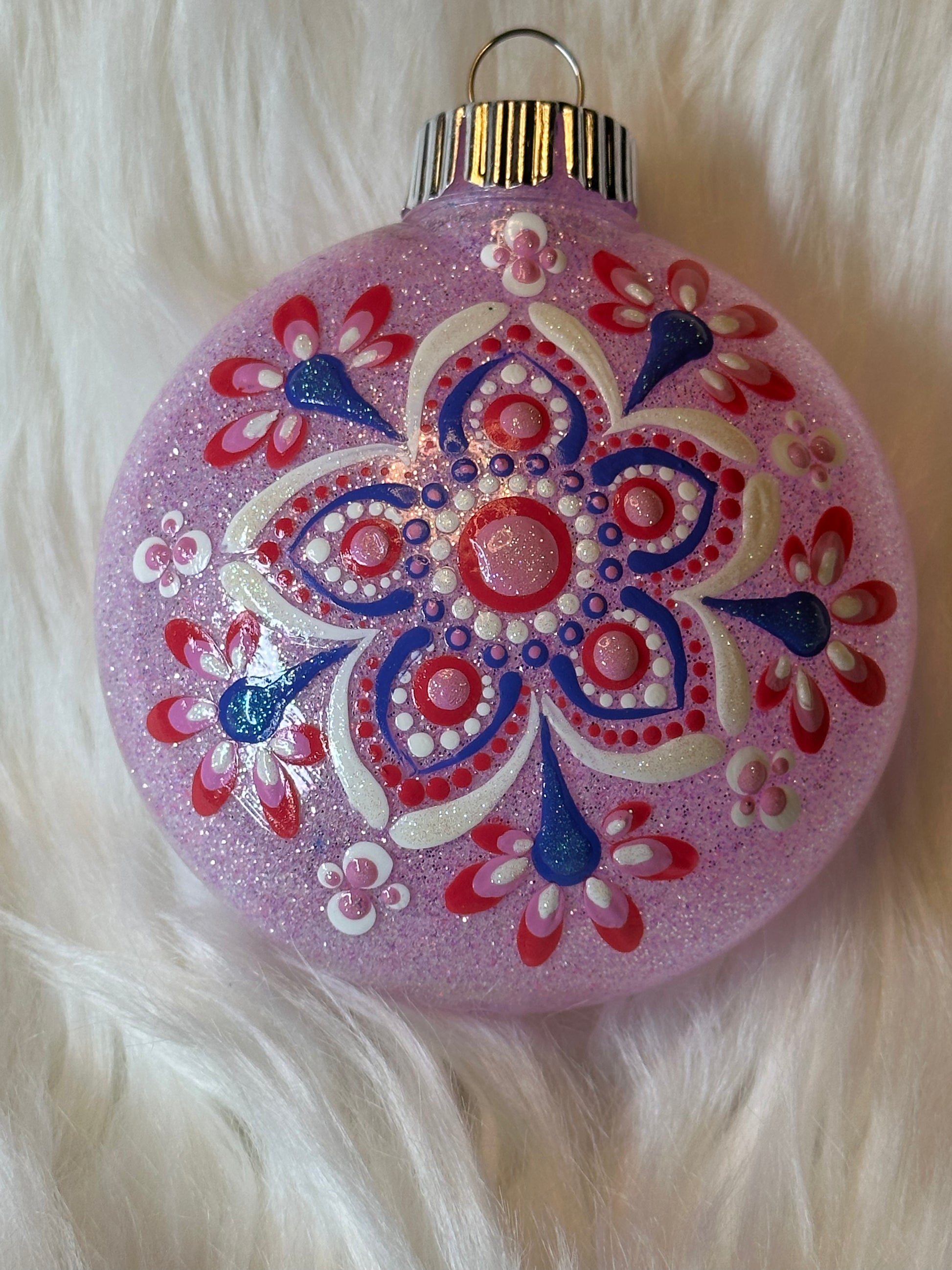 This 3" Shatterproof Glitter Christmas Ornament features a hand-painted mandala design that sparkles with intricate details and shimmering glitter. The perfect blend of holiday cheer and artistic beauty, this ornament adds a touch of elegance and serenity to your Christmas tree. Crafted with care, it combines the durability of shatterproof material with the calming beauty of mandala art, making it a lasting addition to your festive decor for years to come.